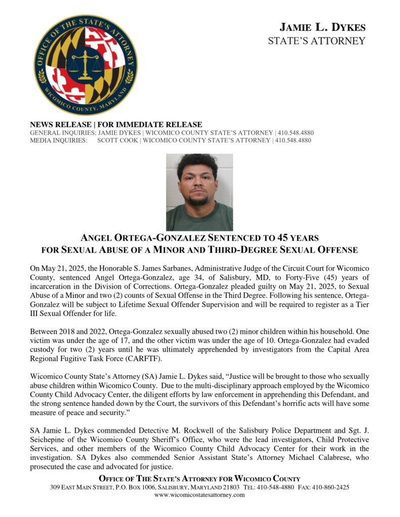Angel Ortega-Gonzalez Sentenced To 45 Years For Sexual Abuse Of A Minor And Third-Degree Sexual Offense