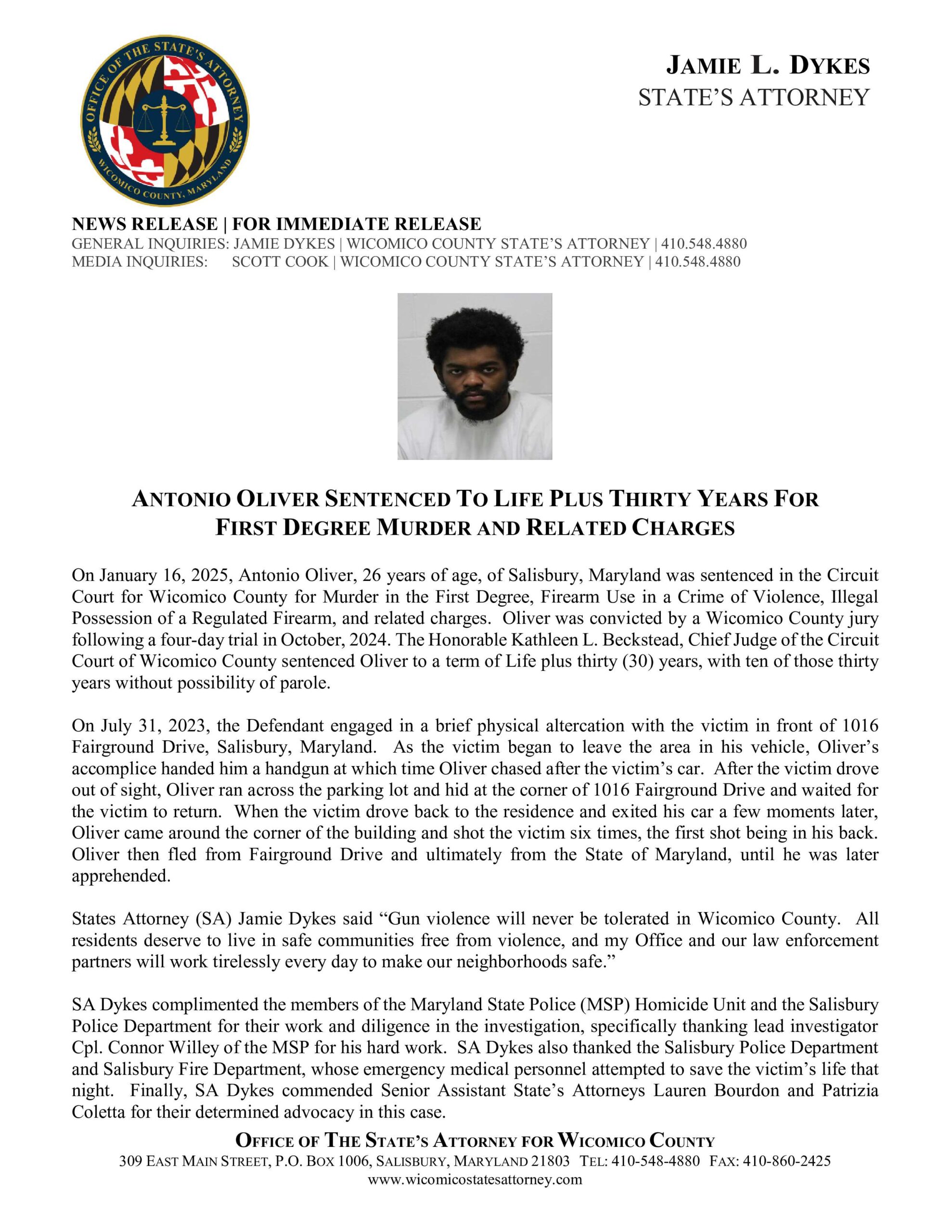Antonio Oliver Sentenced To Life Plus Thirty Years For First Degree Murder And Related Charges