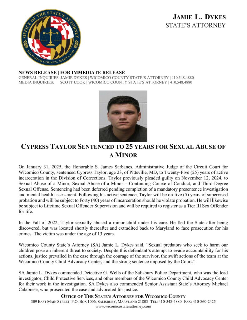 Cypress Taylor Sentenced To 25 Years For Sexual Abuse Of A Minor