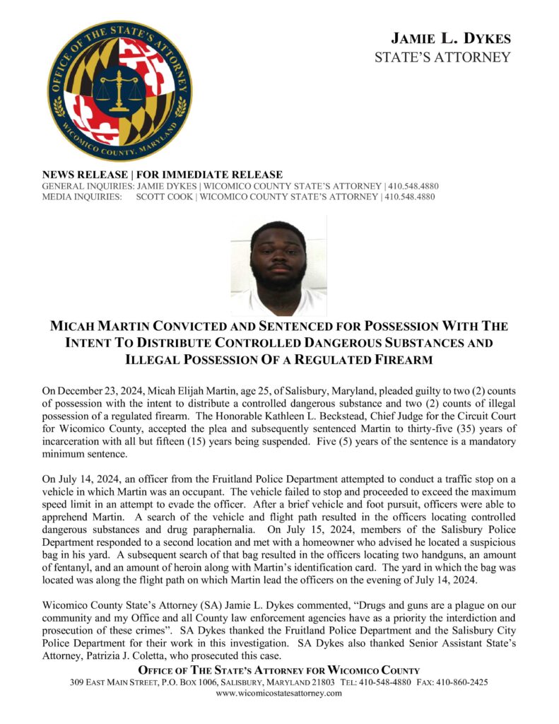 Micah Martin Convicted And Sentenced For Possession With The Intent To Distribute Controlled Dangerous Substances And Illegal Possession Of A Regulated Firearm