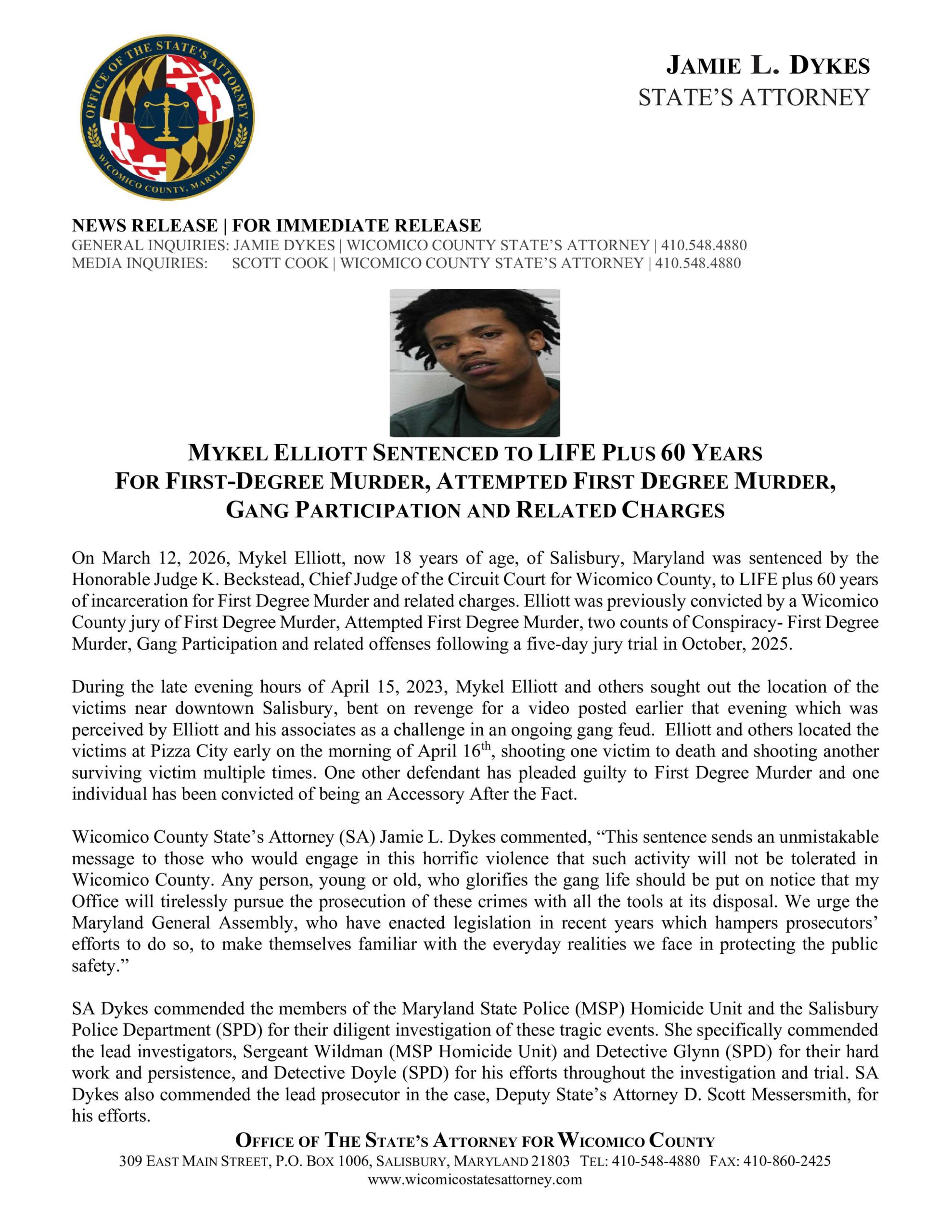 Mykel Elliott Sentenced to Life Plus 60 Years For First-Degree Murder, Attempted First Degree Murder, Gang Participation And Related Charges